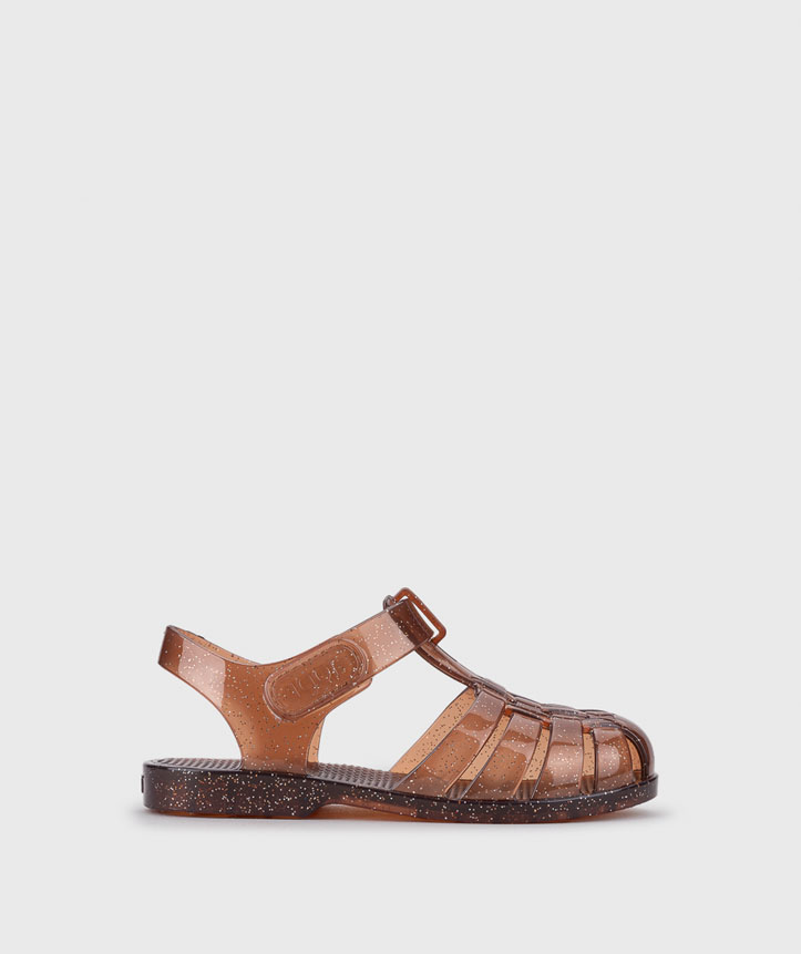 Cangrejera clásica con acabado en glitter y cierre adherente.